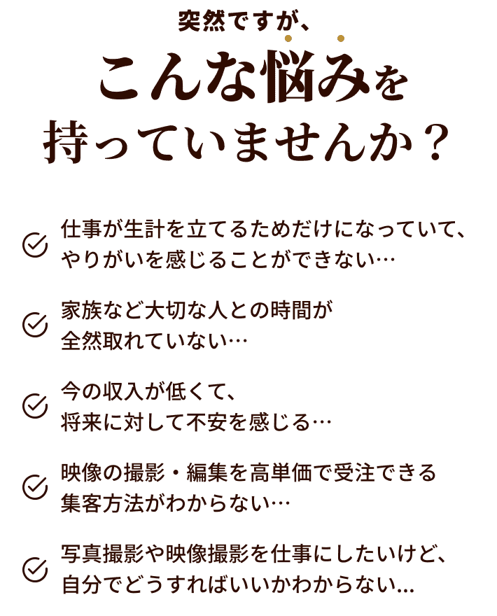 エモーショナル映像クリエイターは、一般の映像クリエイターとは違い、個人で仕事の依頼を受け、撮影から編集まで一貫して行います。なので、仲介手数料などを取られることもなく、仕事の報酬を多く受け取ることができます。