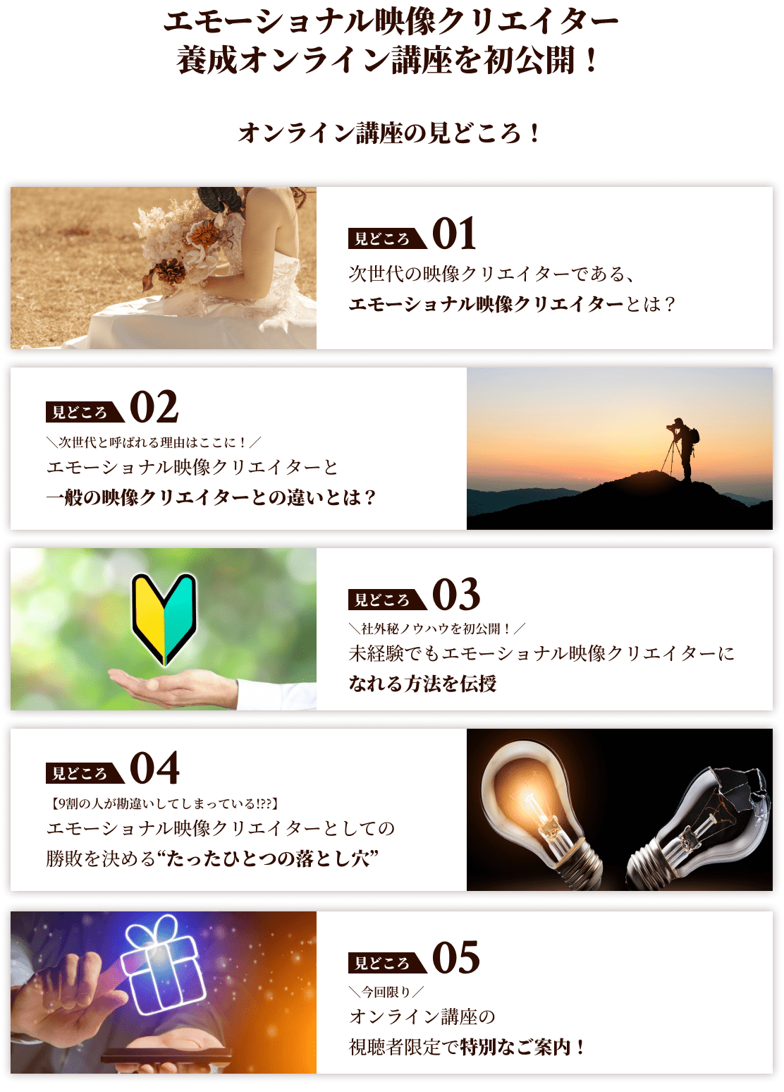 はい、動画編集のスキルや撮影スキル等がなくても大丈夫です。これまでエモーショナル映像クリエイターになった方々もほとんどの方は全くの未経験から取り組んでいます。プログラムの中でもお伝えしていますので、ぜひ最後まで当プログラムを受講ください。